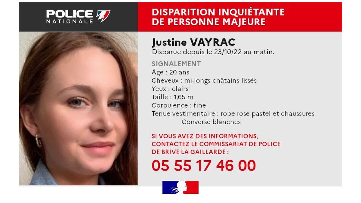 15 hours agoJustine Vayrac 20 ans avait disparu aux alentours de trois heures du matin dans la nuit de samedi à dimanche après une sortie en discothèque à Brives-la-Gaillarde en Corrèze. Elle a disparu dans la nuit de samedi à dimanche alors quelle était en discothèque à Brive-la-Gaillarde. 13 hours agoJustine Vayrac une jeune Lotoise de 20 ans a disparu dans la nuit de samedi à dimanche à Brive-la-Gaillarde Corrèze.